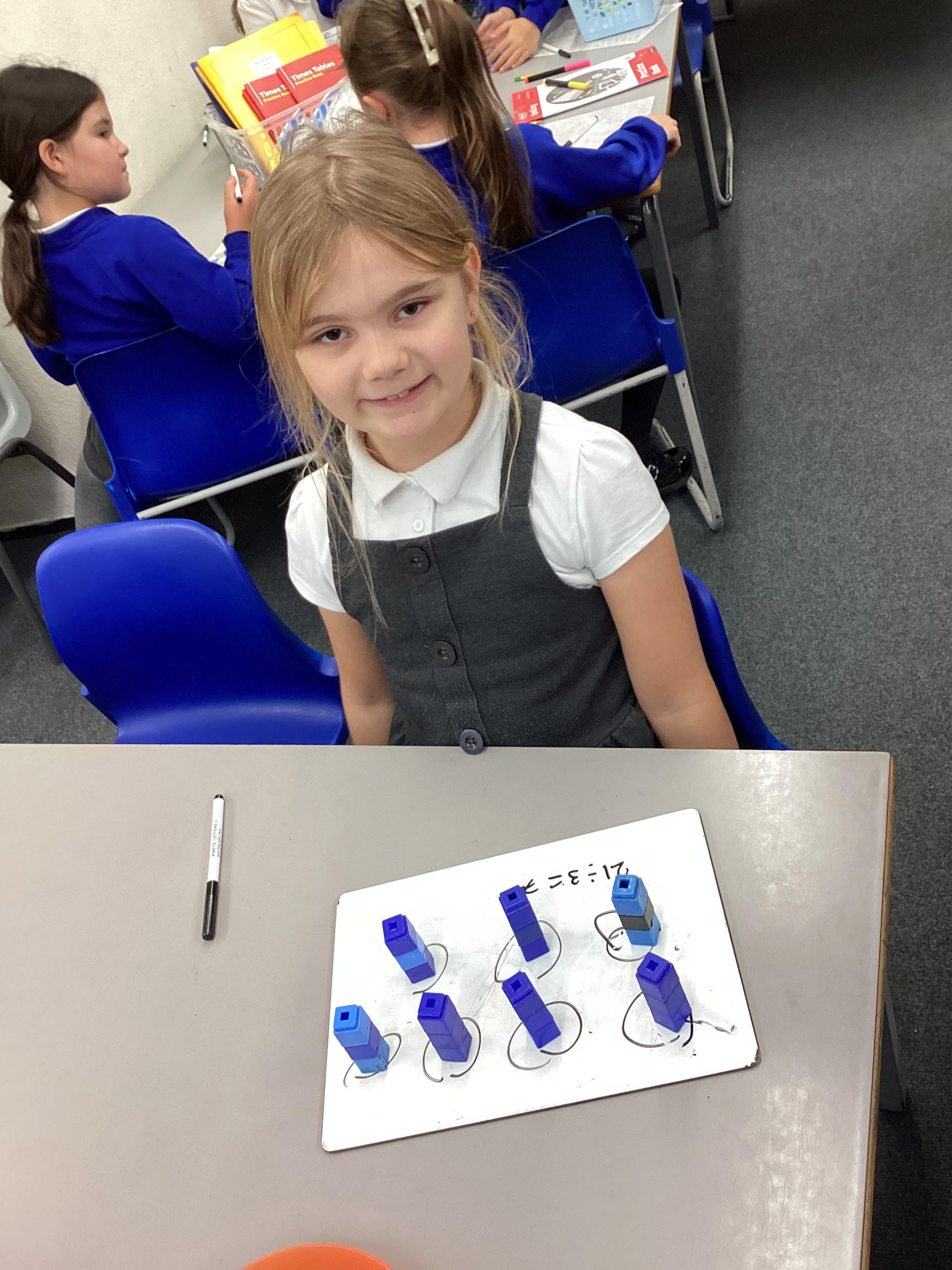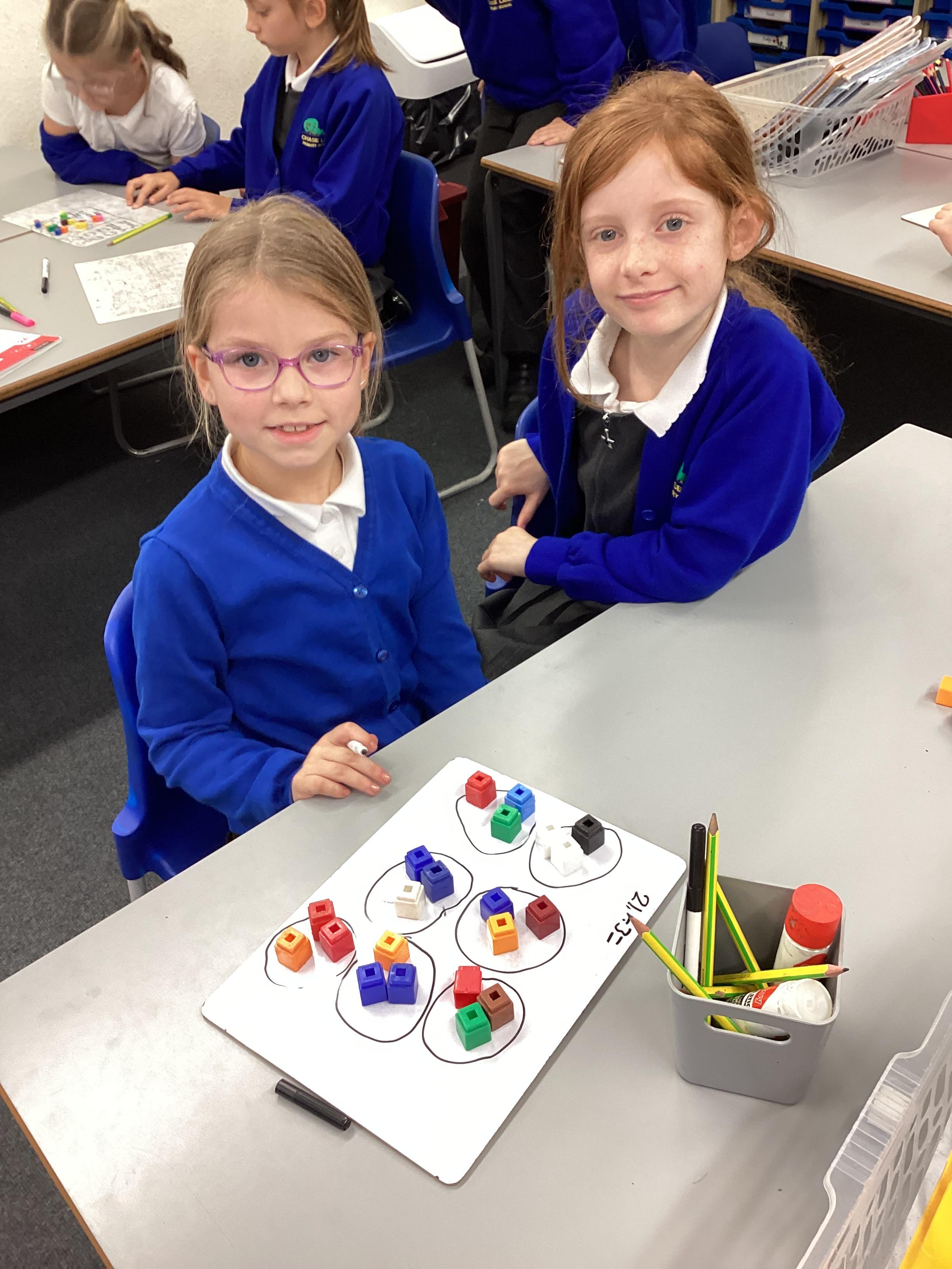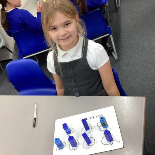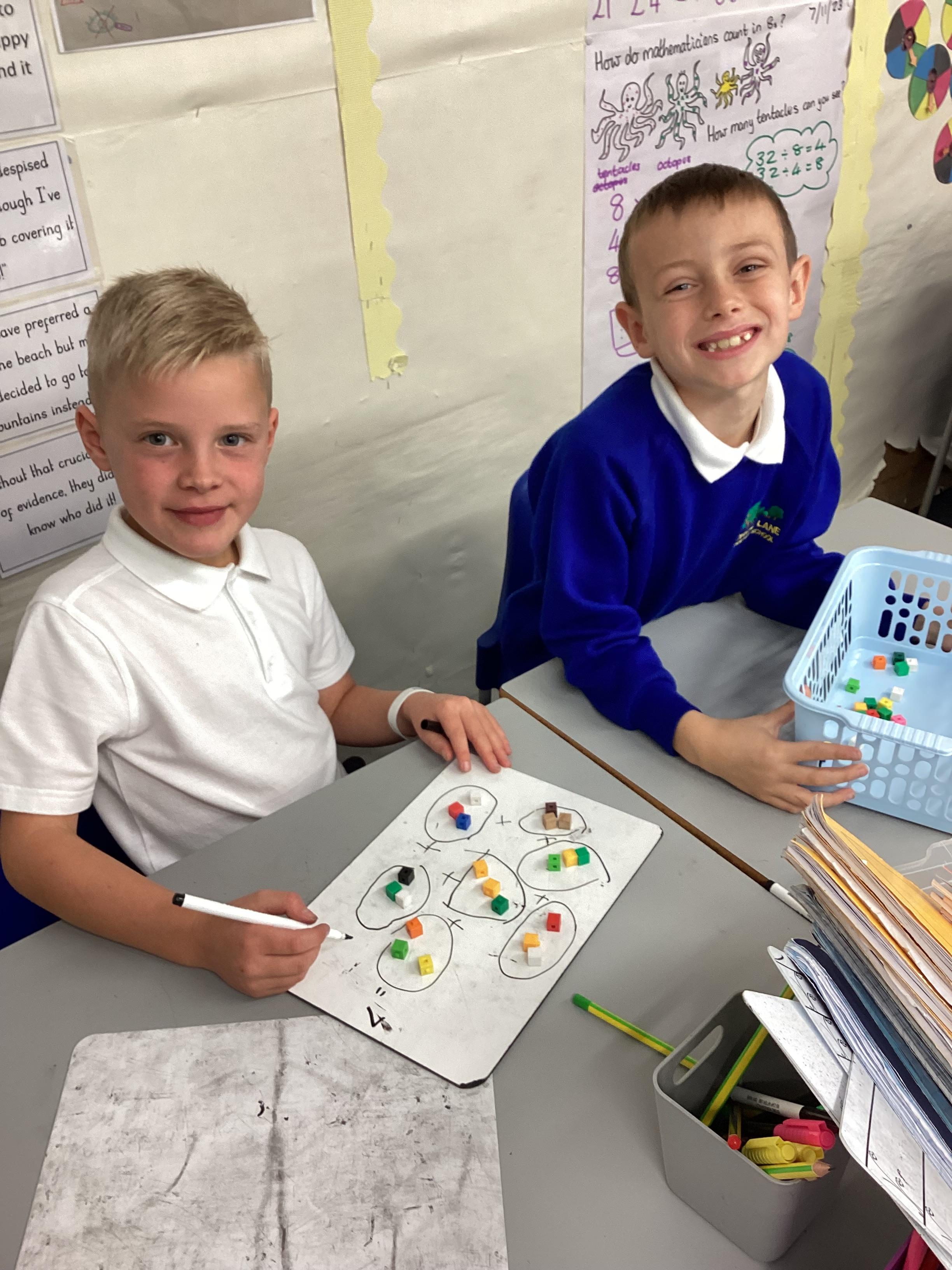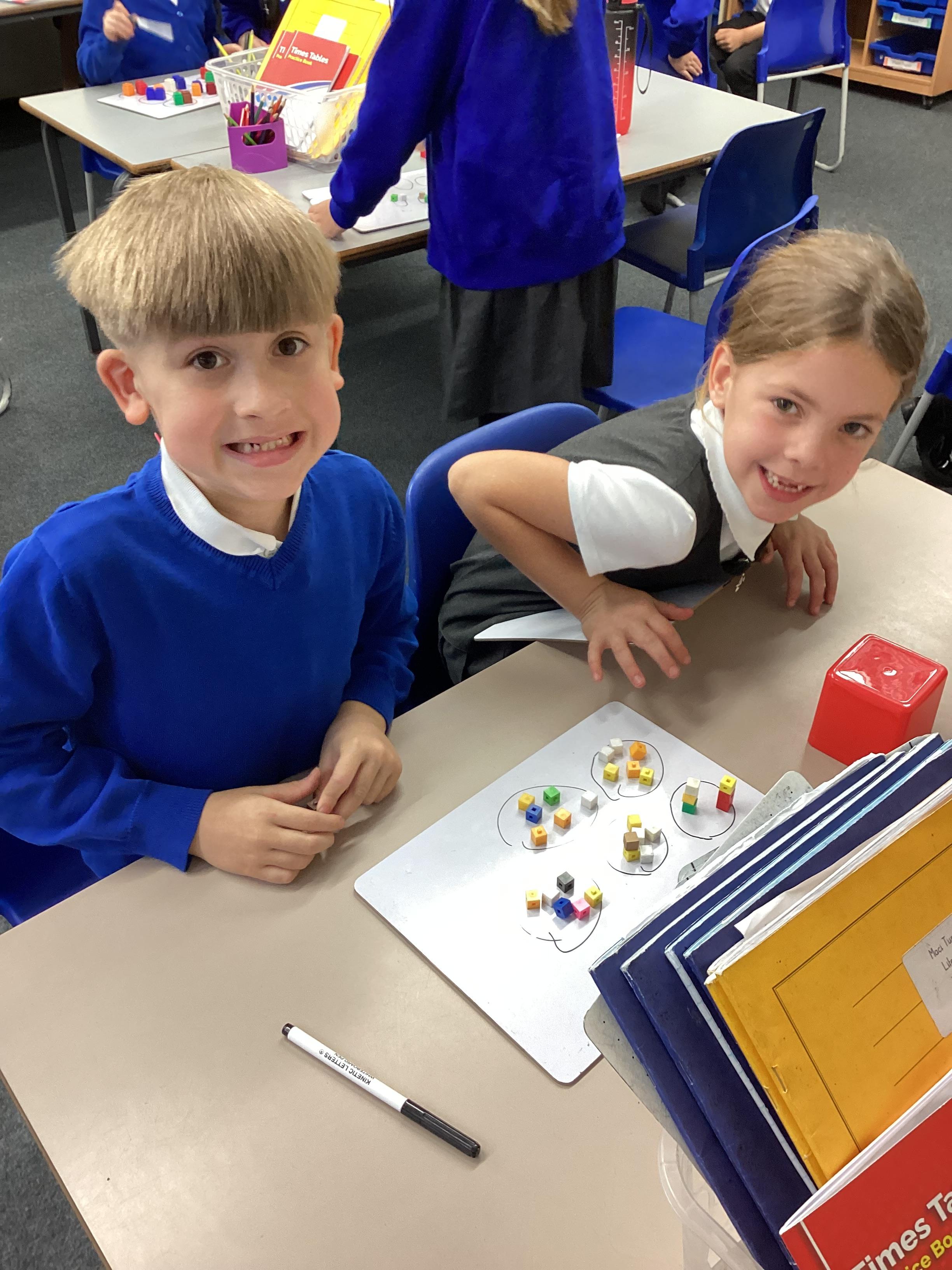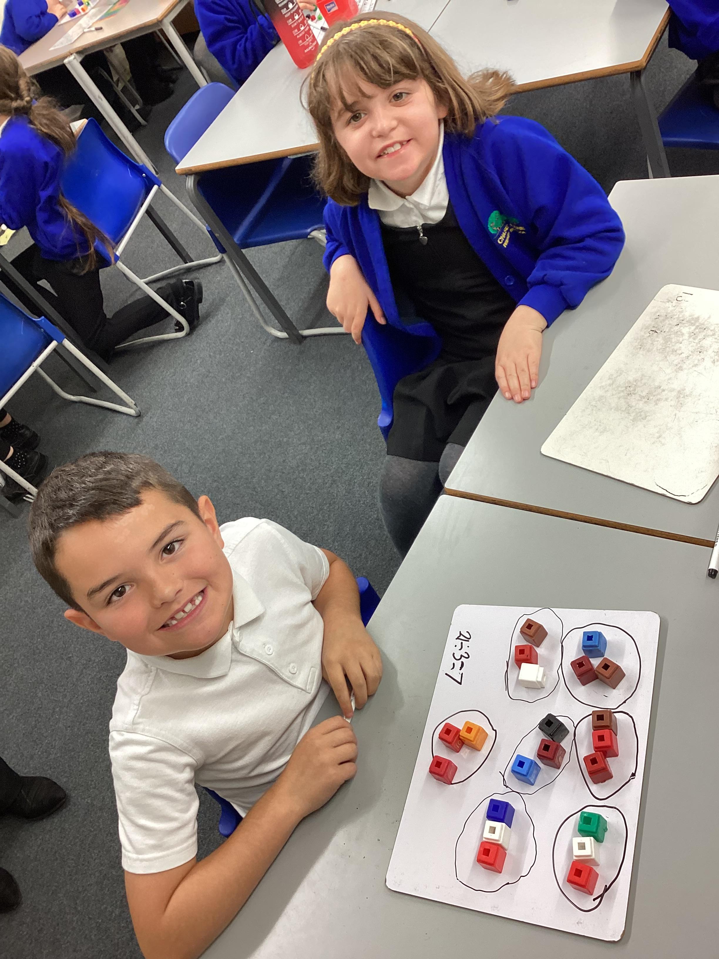 In maths we have been focusing on division and multiplication. Working with our partners, using cubes and wipe boards we created equal groups to help us work out various division questions! Below are some photos of our partner work.