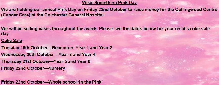 We would like to say a big thank you for helping us raise money on Pink Day! The total raised was £495, which will be going to the Collingwood Cancer Care Centre at the Colchester Hospital.