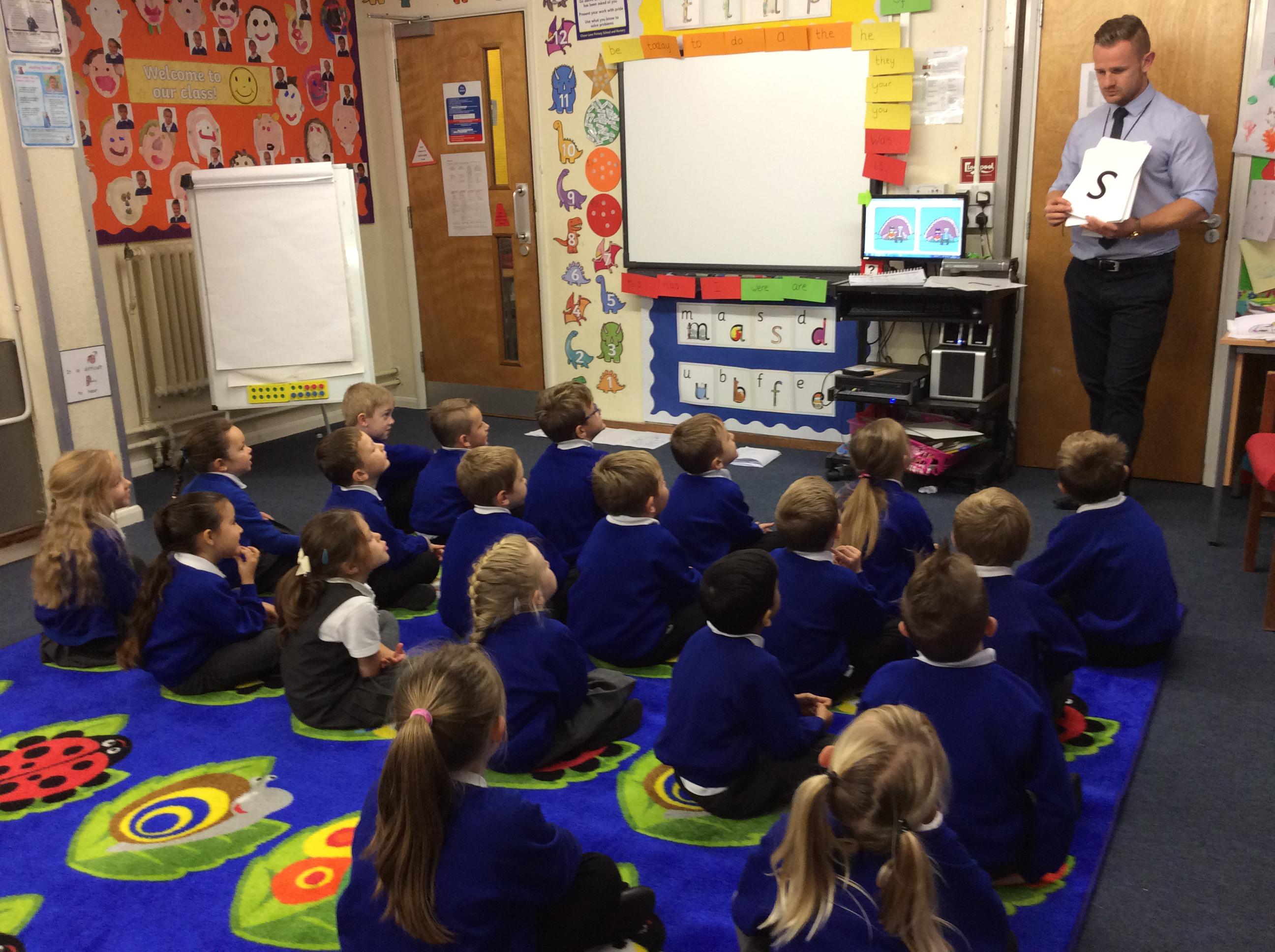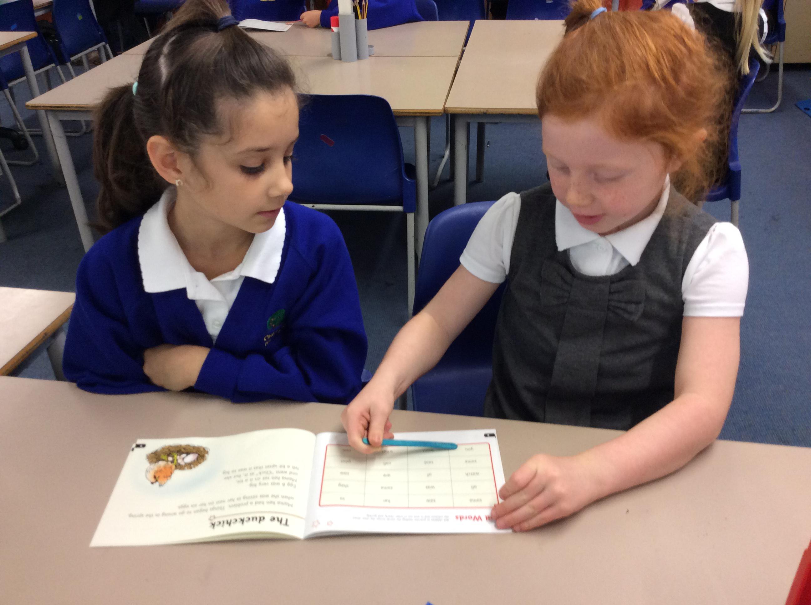 Children are taught to 'Fred Talk' their words by sounding out and blending to read words. For example, 's, a, t- sat'.