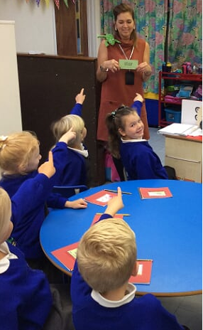 Pupils begin by saying a sentence out loud, which has been modelled by the teacher. When they can remember the order of the words and say them out loud confidently, actions for the punctuation can be introduced. They continue to say the sentence out loud, including the actions. The teacher will then model the writing process by regularly re-reading the sentence with the punctuation actions and using spelling strategies already taught. The completed sentence is hidden and the children use the same process to write the same sentence independently.