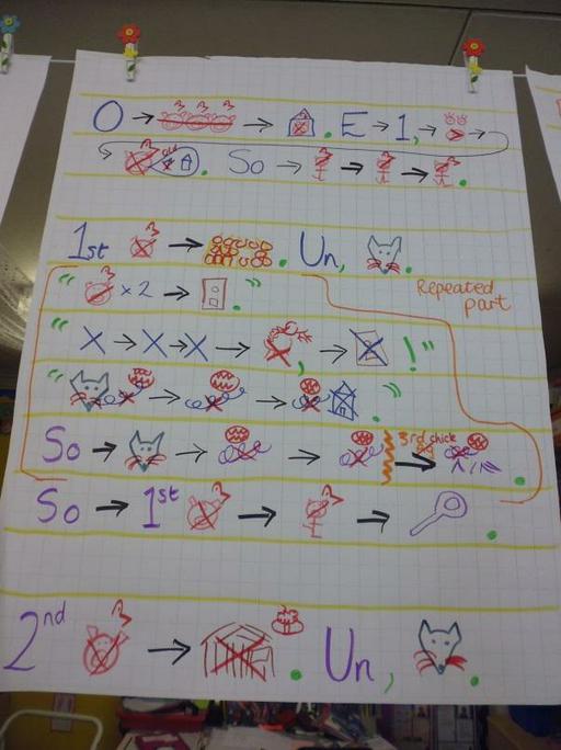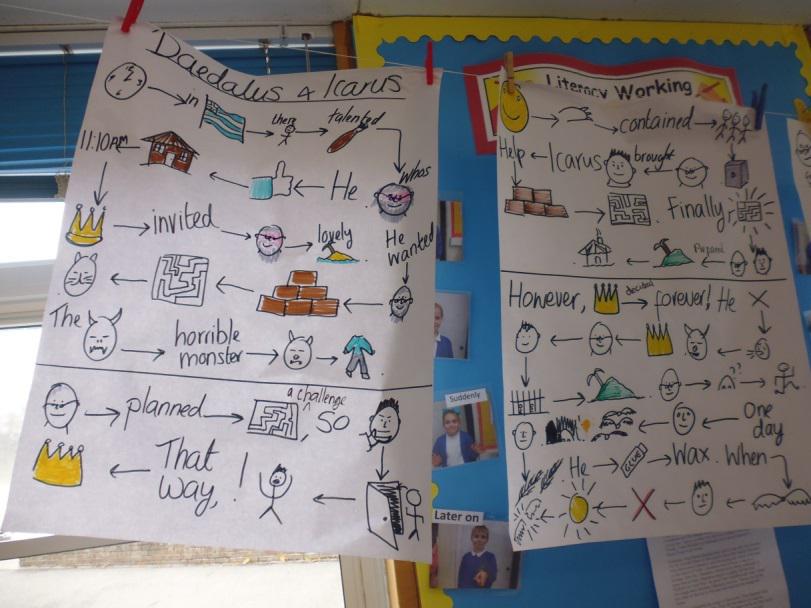 During this phase the children create actions to accompany the oral re-telling of the story. They also create story maps, using pictures and symbols, to depict actions and events from the text. The key to success for the children is that they internalise the text type through repetition and rehearsal. They also begin to look closely at the language and text features that have been used.